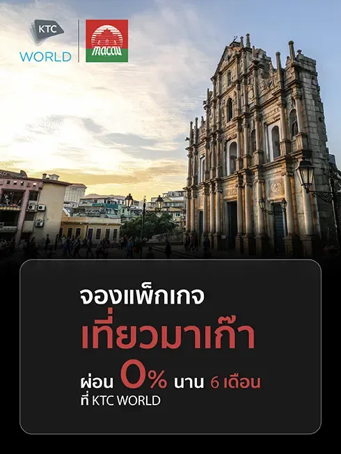 เปิดประสบการณ์ท่องเที่ยวมาเก๊า ในแบบที่ไม่ซ้ำใคร กับโปรโมชั่นแพ็กเกจท่องเที่ยวมาเก๊าสุดพิเศษ 3 วัน 2 คืน เริ่มต้น 19,000 บาท/คู่ หรือรับส่วนลด 1,000 บาท เมื่อมียอดใช้จ่ายผ่านบัตรเครดิต KTC ในผลิตภัณฑ์ท่องเที่ยวเส้นทางมาเก๊า ตามเงื่อนไขที่กำหนด สิทธิพิเศษสำหรับสมาชิกบัตรเครดิต KTC เมื่อจองที่ KTC World Travel Service